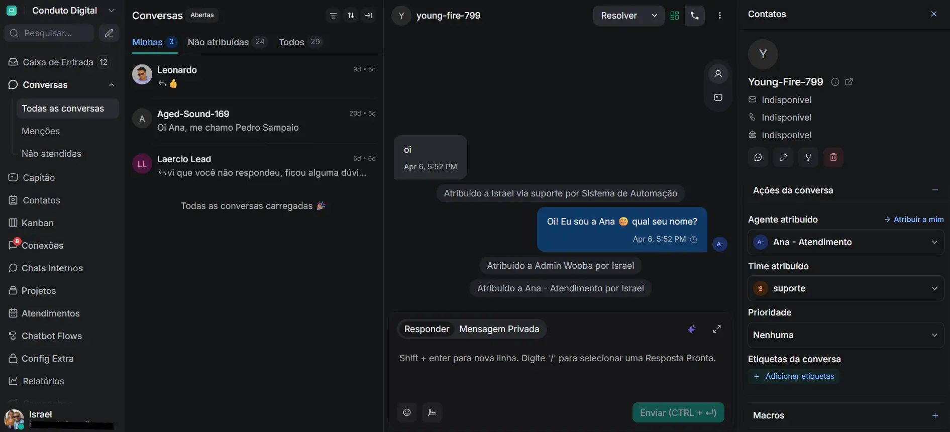 Quando uma nova mensagem chegar, basta abrir a conversa e responder pela caixa de texto do atendimento. A resposta será enviada ao cliente pelo mesmo canal em que ele iniciou o contato, seja e-mail, WhatsApp ou outro canal conectado.