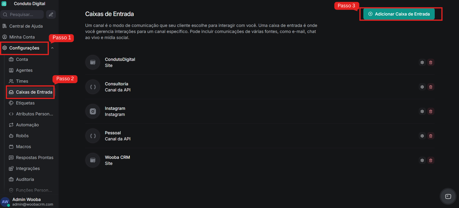Como funcionam as caixas de entrada no Wooba CRM
