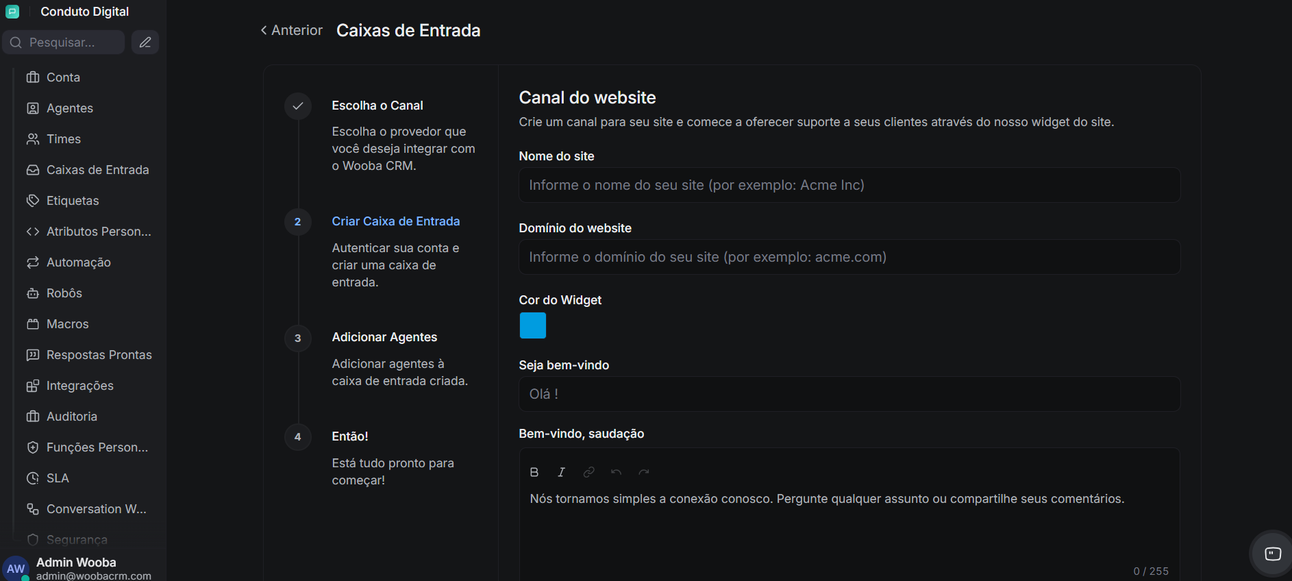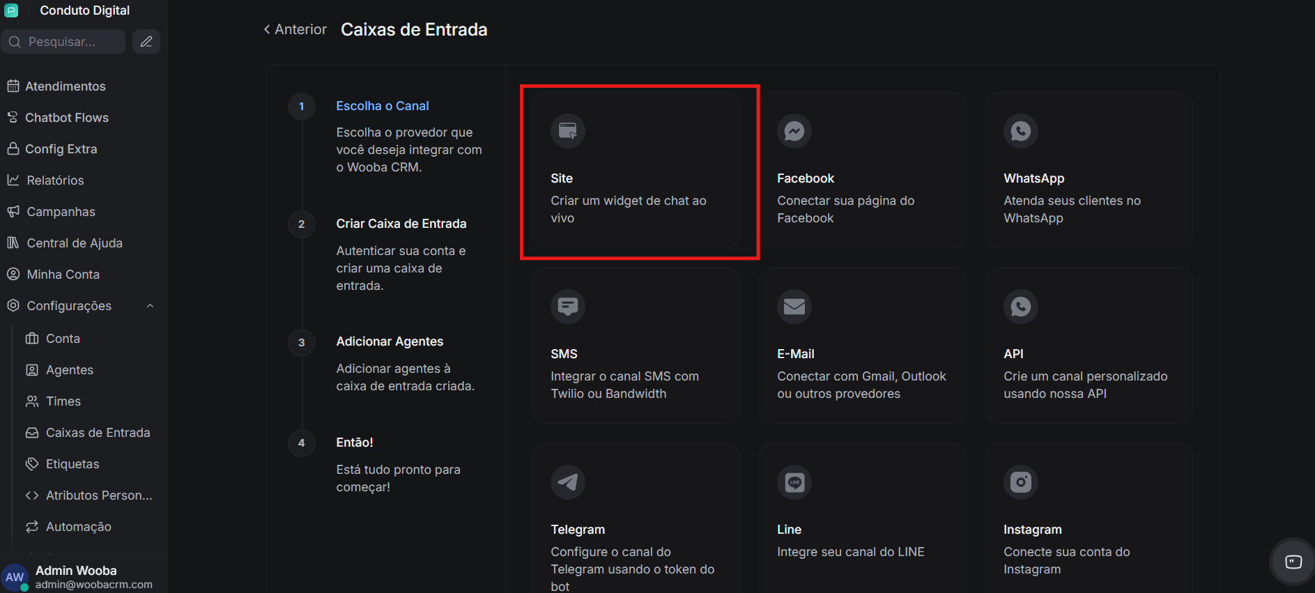 Antes de seguir, certifique-se de que você já tem acesso à sua conta no Wooba CRM e permissão para configurar uma caixa de entrada. Neste guia, o exemplo usado é o canal de chat do site, que é uma das formas mais simples de iniciar seus primeiros testes na plataforma.