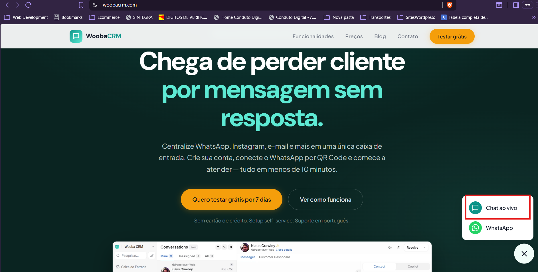 Agora volte ao painel do Wooba CRM. A mensagem enviada no site deve aparecer como uma nova conversa na sua lista de atendimento. A partir daí, você já pode abrir o histórico e responder normalmente.